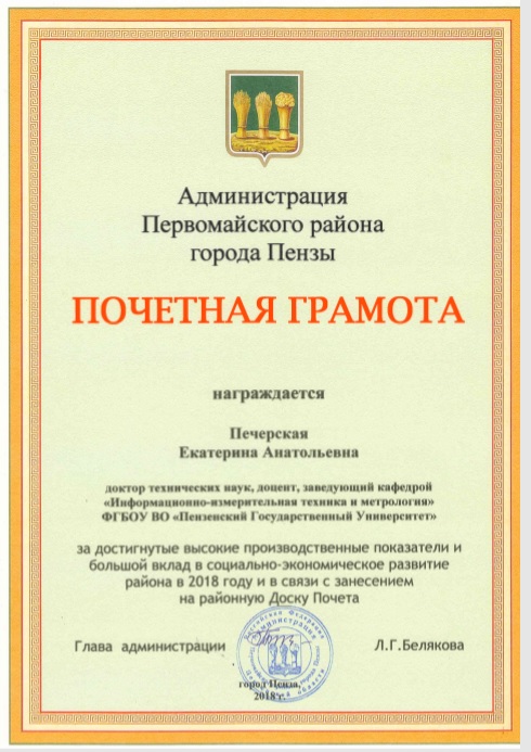 Заведующая кафедрой «Информационно-измерительная техника и метрология» ПГУ занесена на доску почета Первомайского района г. Пензы