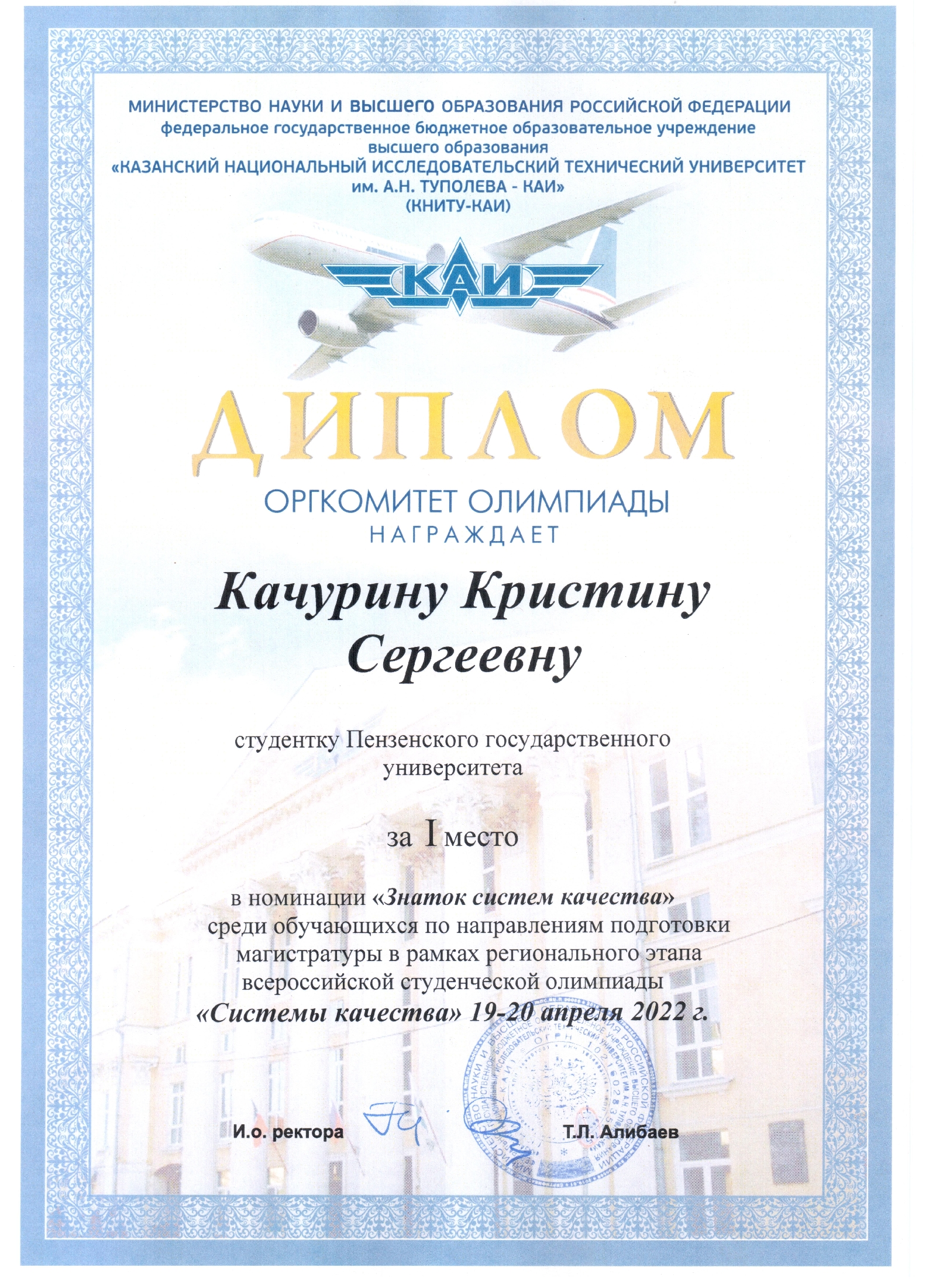 По итогам олимпиады 1 место в номинации «Знаток систем качества» по направлению магистратуры завоевала Кристина Качурина, магистрантка первого курса кафедры «Информационно-измерительная техника и метрология» Пензенского государственного университета. К олимпиаде К. Качурину подготовила Марина Бержинская, кандидат технических наук, доцент кафедры «Информационно-измерительная техника и метрология».
